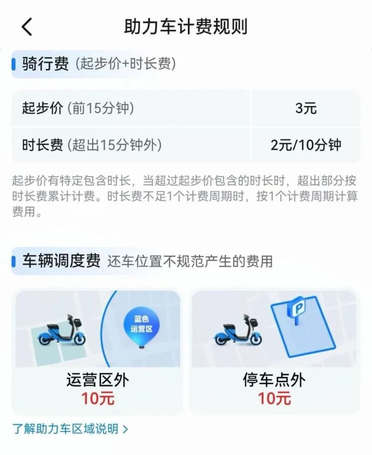 被扣费后刘先生又惊又恼,打开小程序后发现,收费标准竟为“30元起步价,若不小心停在规定停车区外,还要再收20元的区域外还车费”。还车时,平台划定的停车区域极小,在多次尝试后均被告知用户停放位置并不在规定还车区域,无奈下被强制扣除了20元区域外调度费。
